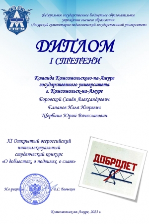 07 апреля 2023 г. на платформе VooV Meeting состоялся XI открытый Всероссийский интеллектуальный студенческий конкурс «О доблестях, о подвигах, о славе», посвящённый развитию авиации в России, деятельности российских авиаконструкторов, пилотов, осваивавших мировое воздушное пространство. Конкурс был приурочен к 100-летию организации Российского общества добровольного воздушного флота «Добролёт».