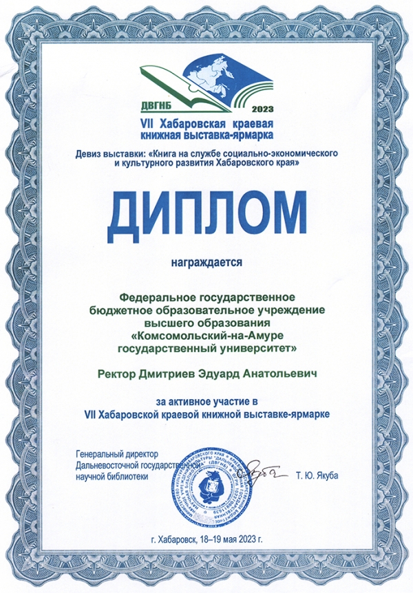 По итогам выставки университет получил диплом за активное участие в VII Хабаровской книжной выставке-ярмарке. Благодарим авторов изданий университета за их научный труд, редакционно-издательский отдел – за качественное оформление изданий.