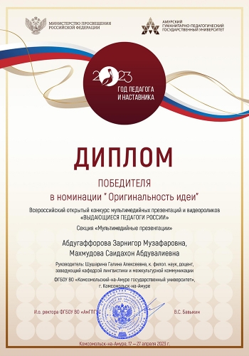 - Диплом победителя в номинации «Оригинальность идеи», секция «Мультимедийные презентации» – Абдугаффоровой Зарнигор, Махмудовой Саидахон, гр. 1МЛм-1 (руководитель – заведующая кафедрой ЛМК Шушарина Г. А.);