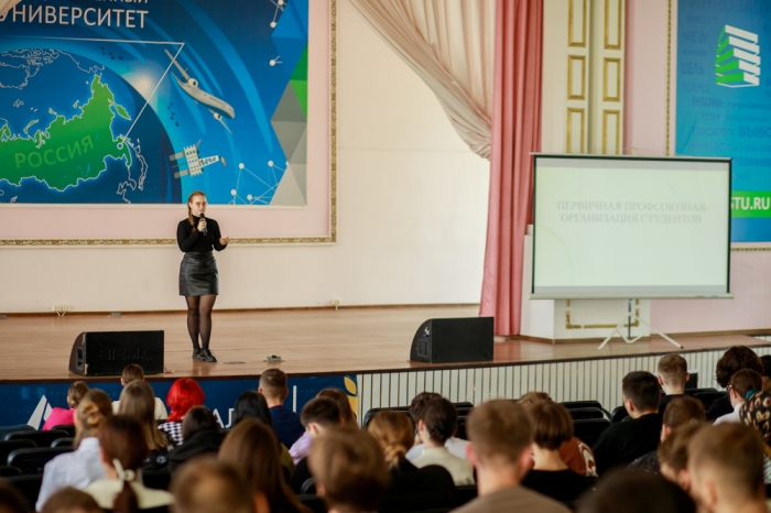 Также перед первокурсниками выступила председатель Первичной профсоюзной организации студентов в КнАГУ Ясинская Софья (ауд. 426а/1).