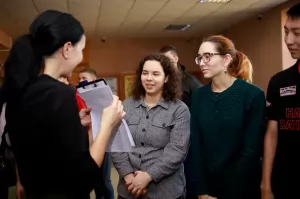 Следующим упражнением стало приветствие, однако оно было необычным: нужно было разбиться на пары, и поздороваться с напарником так, словно это близкий друг, с которым не виделись длительное время, и сегодня неожиданно состоялась встреча. Студенты с удовольствием знакомились, пожимали друг другу руки, говорили тёплые слова, шутили. Упражнение зарядило ребят позитивом.