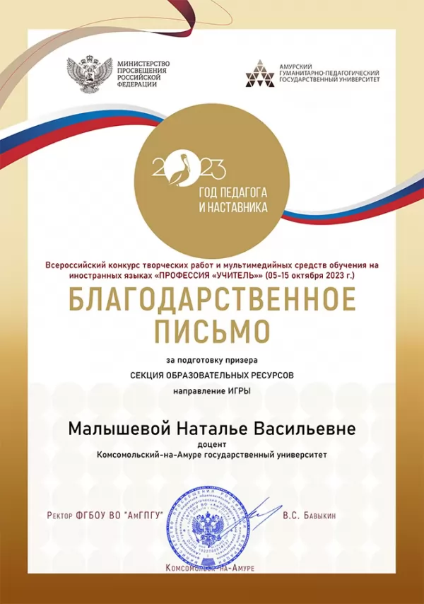 05-15 октября 2023 года в ФГБОУ ВО «АМГПГУ» был проведён Всероссийский конкурс творческих работ и мультимедийных средств обучения на иностранных языках «Профессия учитель». На конкурс было представлено более 200 работ из учебных заведений разных регионов России.