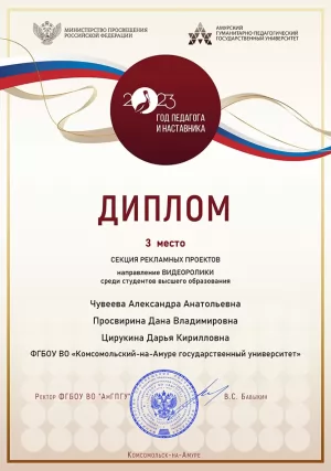 3-е место в секции «Рекламные проекты (направление – видеоролики)» – Просвирина Дана, Цирукина Дарья, Чувеева Александра, гр. 1 БЛб-1 (руководитель Е. А. Мусалитина, кандидат культурологии, доцент кафедры лингвистики и межкультурной коммуникации КнАГУ).