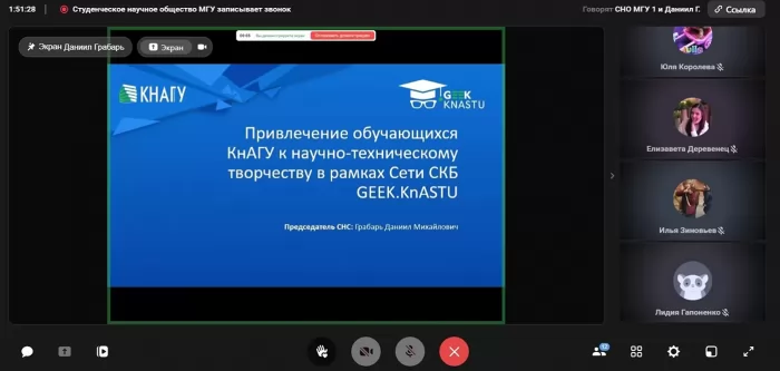 Ещё одно достижение в копилку СНС «Сеть СКБ Geek.Knastu» – победа во Всероссийском конкурсе лучших практик студенческих научных обществ и популяризации науки «PRO-СНО» в номинации «Практики организации научных кружков, СКБ» (авторы проекта – Екатерина Михайловна Димитриади, начальник отдела ОНиПКРС, руководитель Сети СКБ Geek.Knastu, Анна Валинуровна Ахметова, начальник УНИД, куратор Сети СКБ Geek.Knastu, Даниил Михайлович Грабарь, студент ФЭУ, председатель СНС «Сеть СКБ Geek.Knastu»). Защиту проекта в онлайн-формате провела Екатерина Михайловна Димитриади. Целями конкурса стали создание условий для распространения позитивного опыта деятельности студенческих научных сообществ и других молодёжных научных объединений, расширение научных, информационных, организационно-методических связей между ними. Конкурс объединил представителей СНО со всей страны и Ближнего зарубежья.