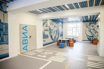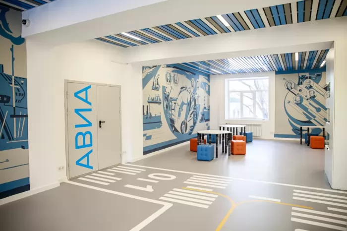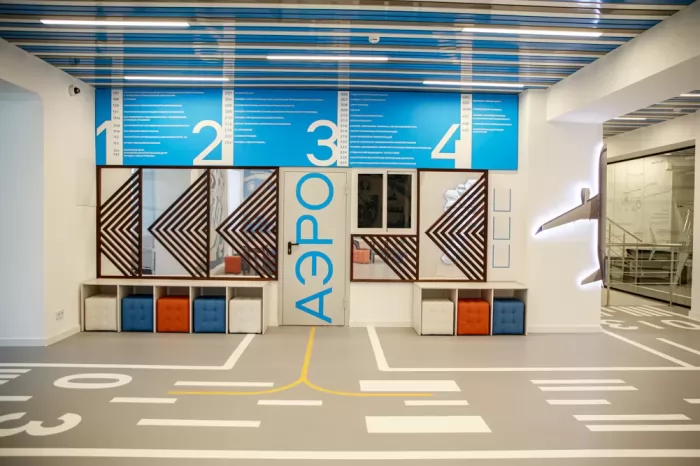 «Мы отталкивались в проекте от авиационной тематики, выбрана была соответствующая цветовая гамма, добавлен такой атрибут, как взлётная полоса на полу. Итог этой работы шокировал, очень приятно видеть свои глазами, как здорово воплощён проект», – поделилась своими впечатлениями автор проекта Анна Семакина.