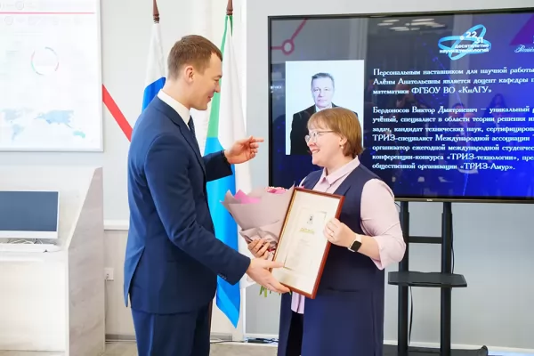 Также в ходе тожественного мероприятия, посвящённого Дню российской науки, губернатор наградил лучших деятелей, внёсших значительный вклад в развитие исследований и подготовку научно-педагогических кадров. Почётная грамота губернатора Хабаровского края вручена ректору ФГБОУ ВО «КнАГУ» доктору технических наук Эдуарду Анатольевичу Дмитриеву. Диплом лауреата премии Губернатора Хабаровского края для молодых учёных получил Бехруз Довудходжаевич Табаров, кандидат технических наук, доцент кафедры ЭПАПУ.