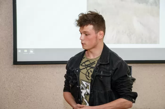 Затем к участникам встречи обратился руководитель студенческого патриотического клуба КнАГУ «Я горжусь» Михаил Климанов (гр. 3ГУб-1, ФЭУ). Он рассказал присутствующим о деятельности клуба, пригласил студенческую молодёжь активно участвовать в мероприятиях клуба, отметил важность проекта «Я горжусь героями».