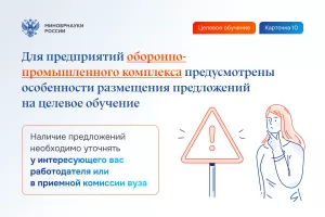 Для предприятий оборонно-промышленного комплекса предусмотрены особенности размещения предложений на целевое обучение. Наличие предложений необходимо уточнять у интересующего вас работодателя или в приёмной комиссии вуза.