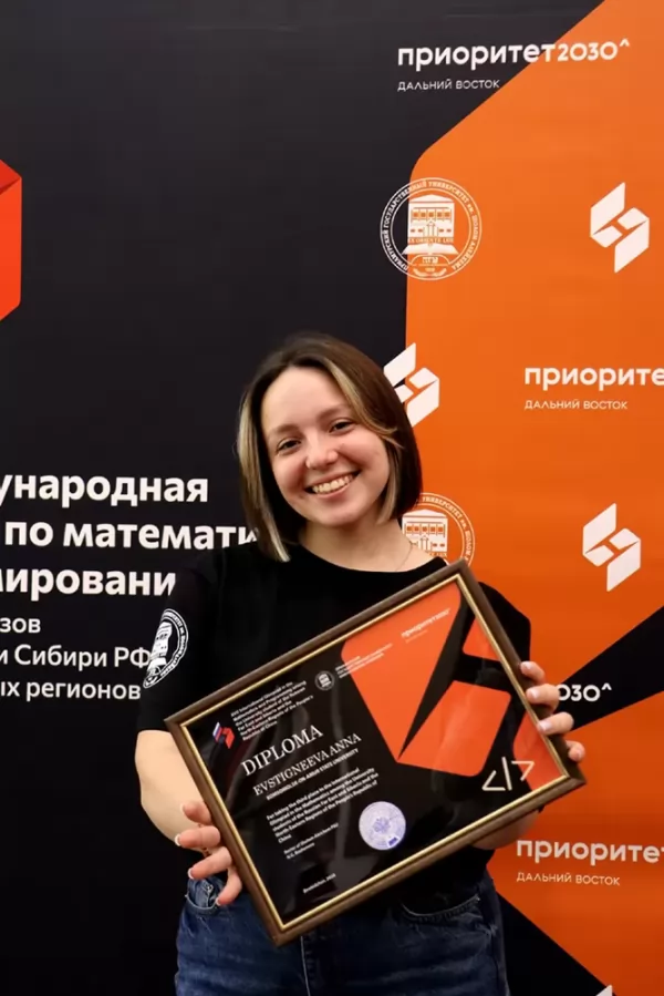 Поздравляем Анну Евстигнееву с 3-м местом в Международной олимпиаде по математике и программированию среду вузов Дальнего Востока России и Китайской Народной Республики! Нашим студентам – математикам и программистам – желаем дальнейших успехов, непрерывного стремления совершенствовать свои знания в области математики и программирования!