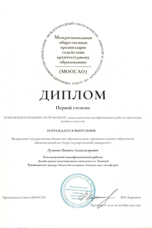- диплом первой степени – Никита Лузянин, ВКР «Дизайн-проект автоспортивного комплекса в п. Таёжный» (руководитель Н. В. Гринкруг);