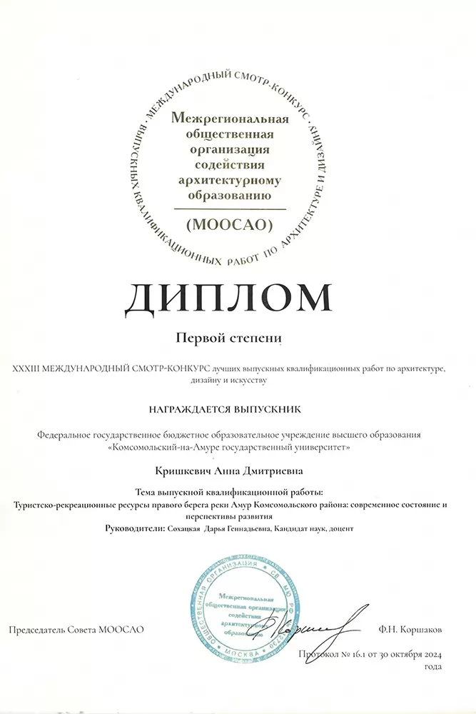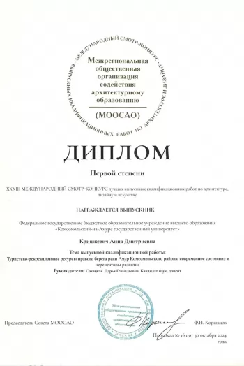 - диплом первой степени – Анна Кришкевич, ВКР «Туристско-рекреационные ресурсы правого берега реки Амур Комсомольского района: современное состояние и перспективы развития» (руководитель – Д. Г. Сохацкая);