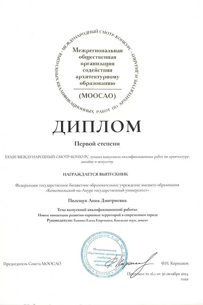 - диплом первой степени – Анна Полещук, ВКР «Новые концепции развития парковых территорий в современном городе» (руководитель Е. Г. Галкина).