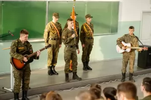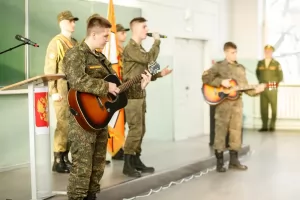 В завершение праздничного мероприятия перед собравшимися выступили студенты университета – участники творческого коллектива «Школа игры на гитаре», которые исполнили композицию «Артиллерия – Бог войны» (К. Потылицын), затем Илья Блинов под гитару спел песню «Флаг моего государства» (Д. Майданов).