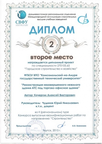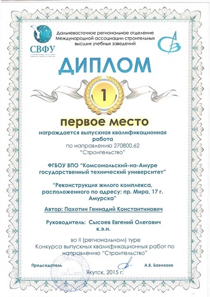 I место - выпускная квалификационная работа Геннадия Константиновича Пахотина по направлению «Строительство» на тему «Реконструкция жилого комплекса, расположенного по адресу: пр. Мира, 17 г. Амурска», научный руководитель, д.т.н. Олег Евгеньевич Сысоев.