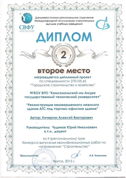 II место - дипломный проект Алексея Викторовича Кочергина по специальности «Городское строительство и хозяйство» на тему «Реконструкция незавершенного нежилого здания АТС под торгово-офисное здание», научный руководитель, к.т.н. Юрий Николаевич Чудинов.