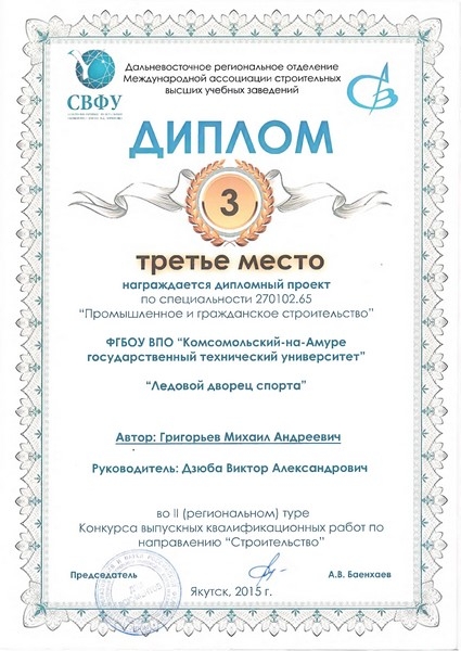 III место – дипломный проект Михаила Андреевича Григорьева по специальности «Промышленное и гражданское строительство» на тему «Ледовой дворец спорта», научный руководитель, к.т.н. Виктор Александрович Дзюба.