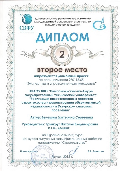 II место - дипломный проект Екатерины Сергеевны Белецкой по специальности «Экспертиза и управление недвижимостью» на тему «Реализация инвестиционных проектов строительства и реконструкции объектов жилой недвижимости в Уктурском сельском поселении», научный руководитель, к.т.н. Наталья Владимировна Гринкруг.