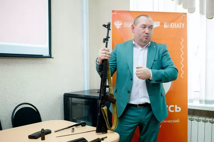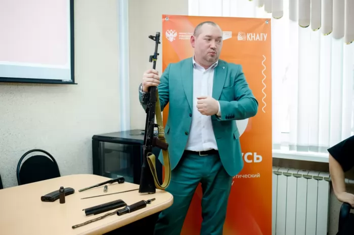 В начале встречи Алексей Михайлович рассказал о своей работе в сфере патриотического воспитания, затем провёл мастер-класс по владению оружием. Он рассказал студентам об истории огнестрельного оружия, научил разборке и сборке автомата Калашникова, рассказал об основных деталях автомата и их назначении. После теоретической части студенты узнали основные правила техники безопасности и перешли к проверке своих знаний на практике – по очереди приступили к разборке и сборке автомата. В ходе мастер-класса студенты активно отвечали на вопросы спикера и показали обширные знания по истории отечественного огнестрельного оружия.