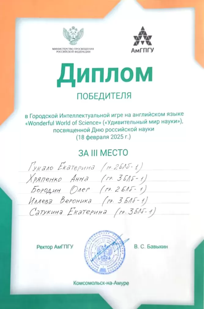 18 февраля студенты СГФ направления подготовки «Лингвистика» приняли участие в интеллектуальной игре на английском языке «Wonderful World of Science», приуроченной к празднованию Дню российской науки. Мероприятие проводилось на базе АмГПГУ.