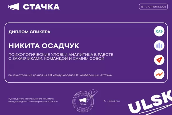«Для меня это первый опыт публичных выступлений, и я решил сделать его максимально живым, – поделился Никита. – Мы разобрали реальные ситуации, где участники примеряли роли аналитика и заказчика. Это помогло наглядно показать, как работают психологические приёмы в IT-коммуникациях».