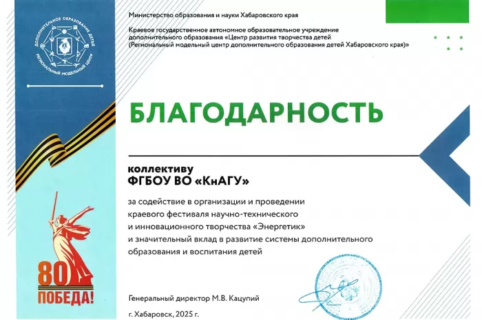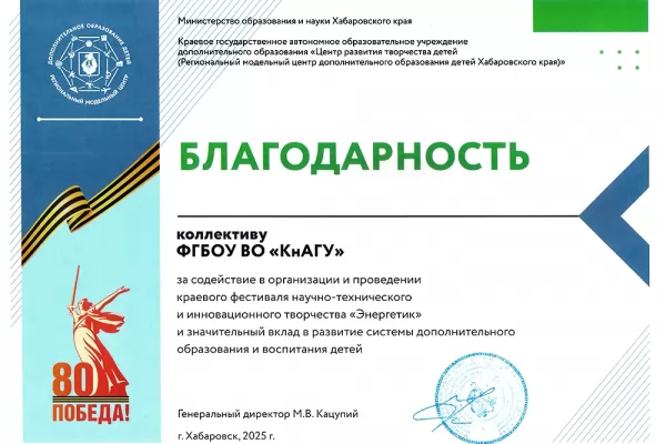 На выставочной экспозиции фестиваля университет представляла Алёна Попова (гр. 1ТЭб-1). В рамках фестиваля школьники узнали, что в КнАГУ активно осуществляется подготовка по инженерным специальностям в таких областях, как энергетика, электроника, самолётостроение, кораблестроение, машиностроение и информационная безопасность. В университете функционирует студенческое научное сообщество «Сеть студенческих конструкторских бюро Geek.Knastu», в рамках которого студенты занимаются научно-исследовательской работой, развивают навыки технического творчества и создают реальные технологические проекты под руководством опытных наставников из университета и бизнеса. Кроме того, в КнАГУ регулярно проходят соревнования по робототехнике, привлекающие молодёжь со всего Хабаровского края. Данные мероприятия способствуют развитию научно-технического творчества, изобретательства, инновационного предпринимательства, а также созданию собственных проектов в школьных кружках и студенческих бюро.