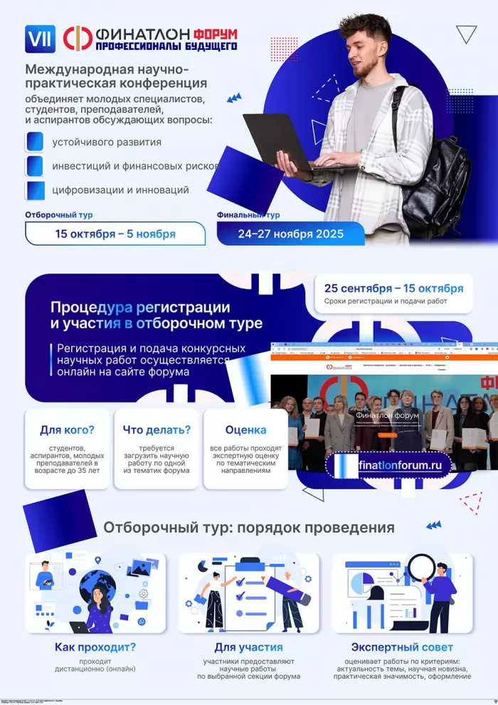 С сентября по ноябрь 2025 года будет проводиться VII Финатлон форум – международная научно-практическая конференция молодых учёных и специалистов по устойчивому развитию, инвестициям и финансовым рискам.