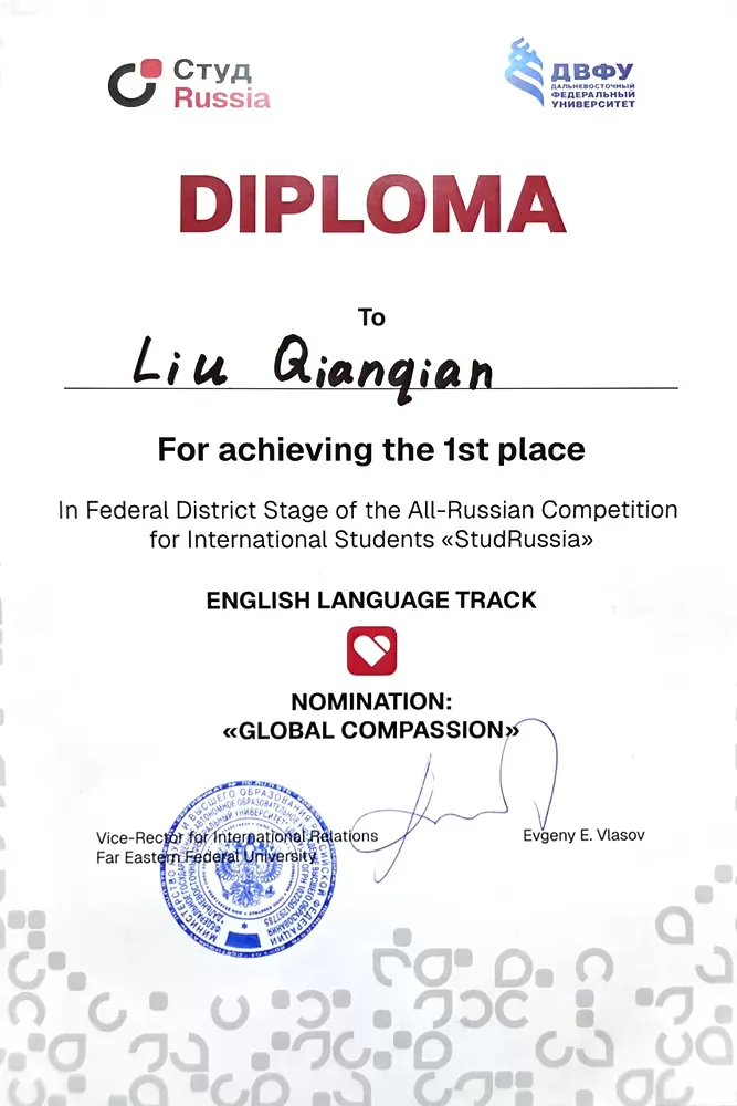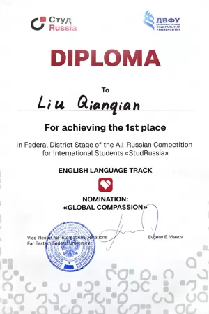 Цяньцянь была приглашена в ДВФУ, г. Владивосток, для участия в окружном этапе, где собралось 140 лучших иностранных студентов из вузов Дальнего Востока. Это была её первая поездка по России. Цяньцянь блестяще выступила в сессии очных конкурсных заданий, проявив лидерские способности, активную жизненную позицию, уровень владения английским языком. По результатам двух дней конкурсных испытаний она завоевала первое место в своей номинации.