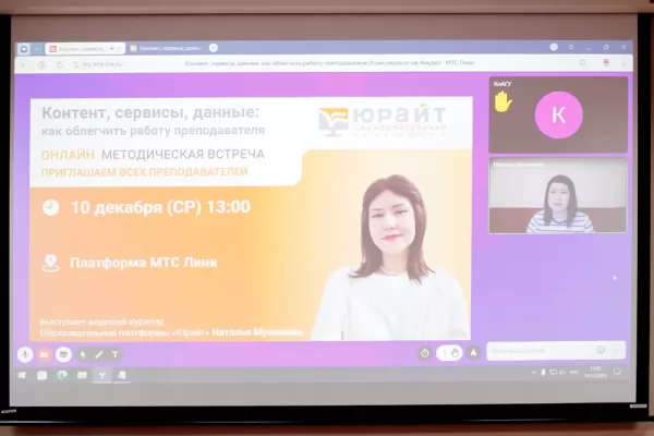 10 декабря в Комсомольском-на-Амуре государственном университете прошла онлайн-встреча образовательной платформы «Юрайт» под темой: «Контент, сервисы, данные: как облегчить работу преподавателей». Данное собрание проходило между преподавателями вуза и ведущим куратором платформы «Юрайт» Натальей Мушаковой.
