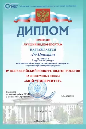 Студентка магистратуры КнАГУ по направлению «Лингвистика» Лю Цяньцянь стала победителем Всероссийского конкурса видеопроектов на иностранных языках «Мой университет».