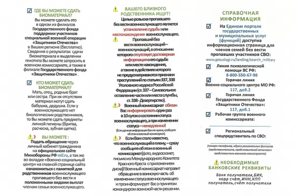 Министерством обороны Российской Федерации, в целях соблюдения прав и реализации социальных гарантий граждан Российской Федерации, снижения роста социальной напряжённости, вызванной отсутствием информации о судьбе пропавших без вести военнослужащих, продолжается выполнение комплекса мероприятий по организации розыска и установлению личности военнослужащих в случае их гибели или пропажи без вести в период проведения специальной военной операции.