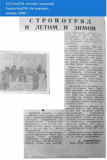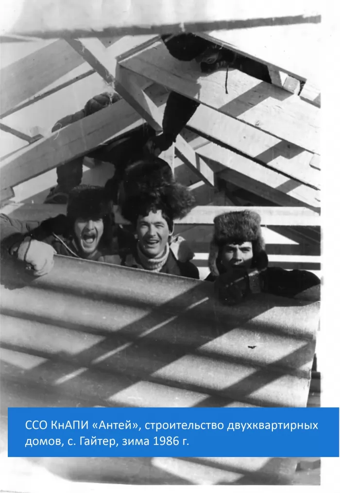 В 1983 году крайкомом КПСС было принято постановление о расширении строительства жилья сельской местности. На слёте студенческих отрядов было решено подключиться к строительству двухквартирных домов из бруса и железобетона в период зимних каникул. КнАПИ активно подключился к движению зимних отрядов, в которые зачисляли студентов успешно сочетавших учёбу и работу в летних стройотрядах. Отряды «Дзержинец», «Антей», «Искатель» нашего института работали в период зимних каникул на строительстве домов в поселках Хабаровского края (с. Пивань, пос. Молодёжный, с. Гайтер) и Еврейской Автономной области (с. Унгун и др.). Бойцы осваивали для себя нелегкое зимнее строительство, то и дело сталкиваясь с трудностями. Поджимали сроки, не хватало профессиональных навыков, были сбои в снабжении материалами и инструментом, но справились со всеми поставленными задачами достойно, возвели дома в срок и надлежащего качества.
