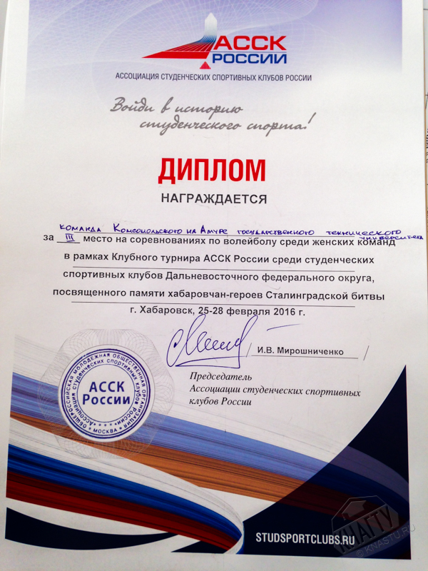 Поздравляем женскую сборную команду по волейболу, занявшую 3 место в клубном турнире АССК России среди студенческих спортивных клубов Дальневосточного федерального округа, посвященном памяти Хабаровчан – героев Сталинградской битвы.