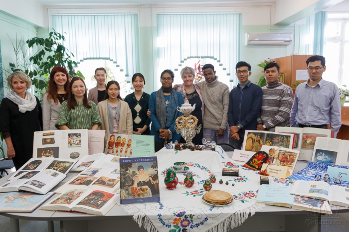 В научно-технической библиотеке КнАГУ для иностранных слушателей подготовительного отделения состоялось мероприятие «Вечер русских культурных традиций». Целью встречи стало ознакомление иностранных граждан, прибывших из стран Бангладеш, Камерун, Сомали, Кореи и Республики Союз Мьянма, с культурой России, создание благоприятного психологического настроя учащихся, формирование их информационной культуры, усиление мотивации на овладение русской разговорной речью.