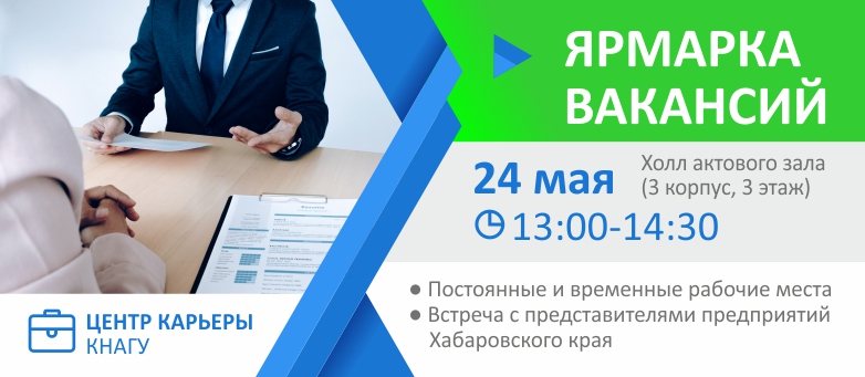Центр карьеры КнАГУ совместно с работодателями города проводит ярмарку вакансий, на которой будут предложены рабочие места как постоянной, так и временной занятости. Приглашаем студентов и выпускников вуза встретиться с представителями предприятий Хабаровского края, пройти собеседование и найти достойную работу!