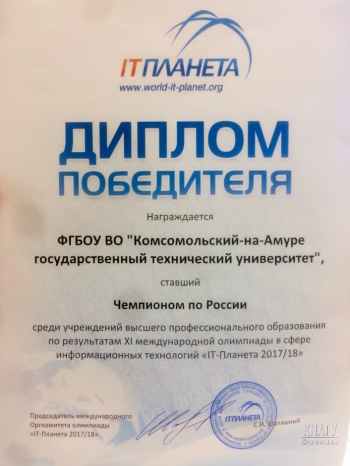 Комсомольский-на-Амуре государственный университет стал чемпионом по России среди учреждений высшего профессионального образования по результатам ХI Международной олимпиады в сфере информационных технологий «IT-планета – 2017/18» (г. Тюмень). Олимпиада является одним из самых масштабных учреждённых в России соревнований в области информационных технологий. Она направлена на выявление, поддержку способных и практически подготовленных студентов и молодых специалистов в сфере информационно-коммуникативных технологий.