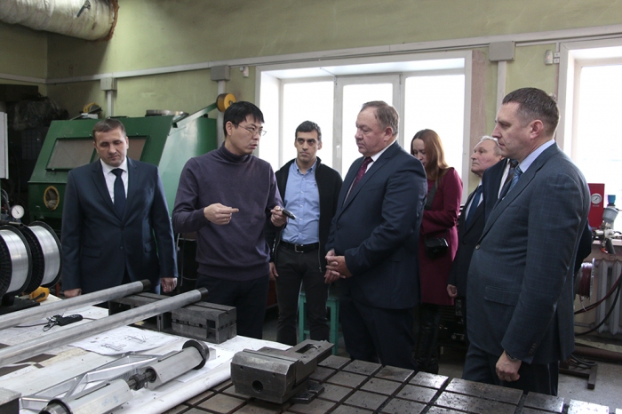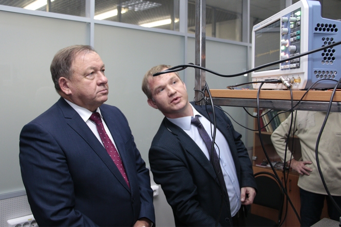 Далее делегация побывала в научно-образовательном центре «Промышленная робототехника и передовые промышленные технологии», где проводятся научно-исследовательские и опытно-конструкторские работы в области технологического применения промышленных роботов и разработки крупных автоматизированных систем. Декан электротехнического факультета А.С. Гудим продемонстрировал гостям оборудование, реализующее реальные технологические процессы, – сборочно-сварочную роботизированную ячейку и роботизированную ячейку механической обработки.