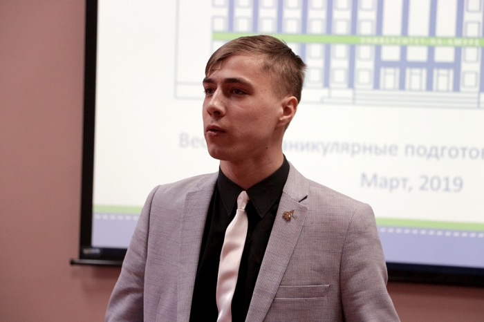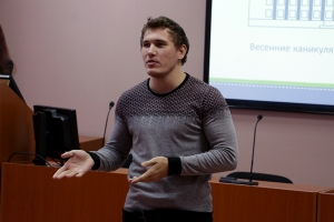Затем студенты рассказали о возможностях, которые предоставляет университет для самореализации, и о своих достижениях. Артём Косичков (гр. 5ПЭб-1, ЭТФ) представил деятельность студенческого конструкторского бюро.