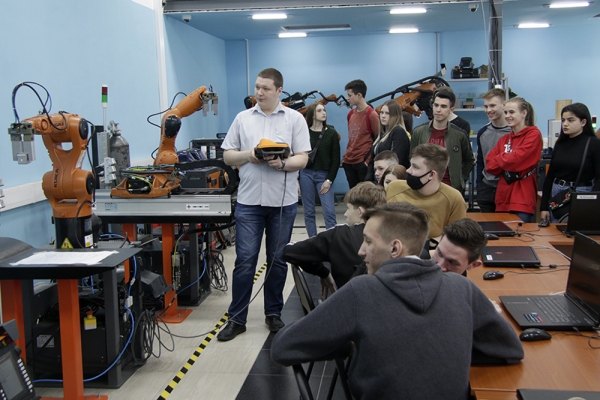 Далее все участники мероприятия посетили научно-образовательный центр «Промышленная робототехника и передовые промышленные технологии» КнАГУ. Руководитель центра С.И. Сухоруков продемонстрировал присутствующим азы автоматики, связанные с работой электро-гидро-пневмостендов, различные операции, производимые промышленными роботами на современном автоматизированном производстве.