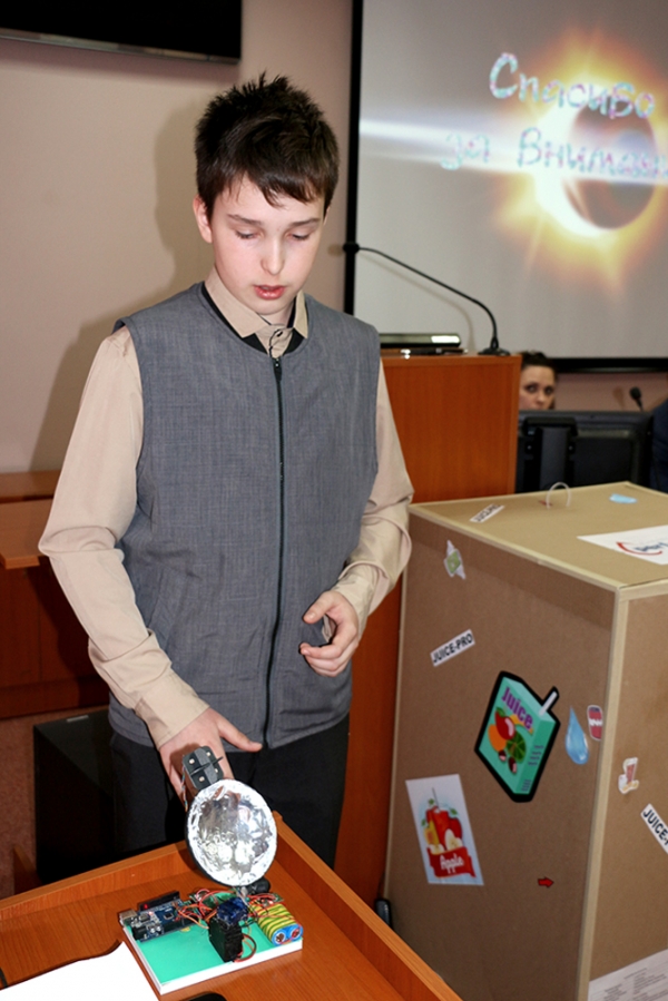 Огромный интерес вызвал проект JUICE-PRO сборной команды DISPENSER’S TEAM в составе Данила Макарьевского, Никиты Артеменко (МОУ СОШ № 2, МОУ СОШ № 6 г. Комсомольска-на-Амуре): «Наш проект представляет устройство для автоматического розлива напитков. Мы создали наш проект, чтобы упросить жизнь человека. Вы подносите стаканчик к аппарату, и он наливает вам напиток. Не нужно нажимать ни на какие кнопки, всё срабатывает автоматически. Надеюсь, всем понравится», – поделился информацией о проекте Никита Артеменко.