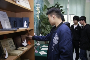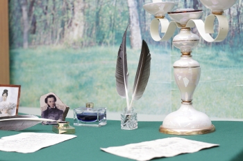 Тёплой встрече студентов с поэтом способствовало и стилизованное оформление читального зала в стиле пушкинской эпохи: старинный подсвечник – канделябр, портрет А. С. Пушкина на камне, гусиное перо и чернильница как символ литературного творчества и поэзии. Именно такими перьями поэт привык писать ещё с лицейских лет. Участники мероприятия, особенно иностранные студенты, с интересом познакомились с выставкой-экспозицией «Читаем пушкинские строки» и книжной выставкой «Он – наш поэт, он – наша слава!..».