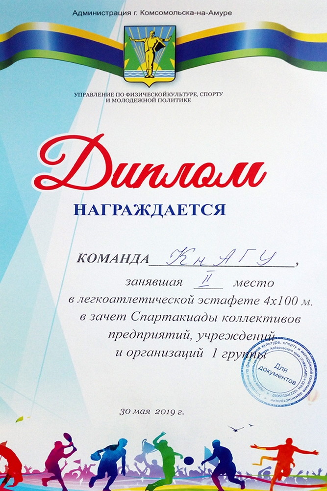 В легкоатлетической эстафете 4х100 команда КнАГУ в составе Евсейчик Ольги (гр. 5ММб-1), Кузнецовой Полины (гр. 6ПЭб-1), Дьяченко Владислава (гр. 6ХТб-2), Мельниченко Маркела (гр. 4ЭЛб-1) заняла 2-е место.