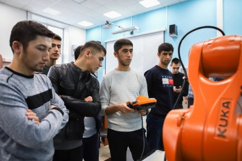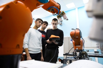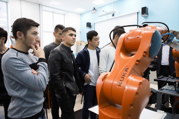 робототехника и передовые промышленные технологии» было проведено базовое обучение основам работы с промышленным роботом (включение, выключение, настройка, перемещение, управление с пульта, ручное управление, режимы работы робота) и изучение базовых элементов настройки (калибровка базы и калибровка инструментов, изучение основ разработки управляющих программ промышленных роботов для решения прикладных практических задач).