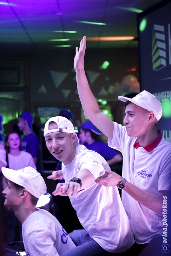 Открыло мероприятие концептуальное перемещение кубов в зале по направляющим. Участники события собрали на сцене конструкцию из кубов, символизирующую знания, опыт, дружбу, уверенность, общение, знакомство, грамотность, подготовленность, энергию, новаторство, развитие, рост, востребованность, полезность, самостоятельность, специальность – все эти элементы сложились в единый символ – эмблему КнАГУ.