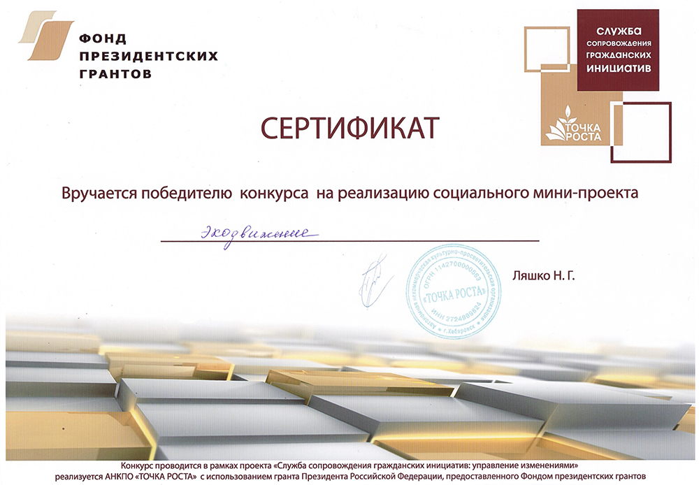 Образовательный блок для более 60 представителей инициативной части населения нашего города провели тренеры-эксперты: Наталья Ляшко – директор АНКПО «ТОЧКА РОСТА», член общественного совета при министерстве культуры Хабаровского края и член Общественной палаты Хабаровского края; Татьяна Сейфи – руководитель Хабаровской региональной общественной организации «Центр общественных инициатив «Ладъ», эксперт в сфере поддержки и развития некоммерческих организаций и гражданских инициатив. Итогом этого обучения стали 12 социальных проектов: четыре проекта стали победителями этого конкурса и получили финансовую поддержку, среди которых проект студентки социально-гуманитарного факультета Сергеевой Александры.