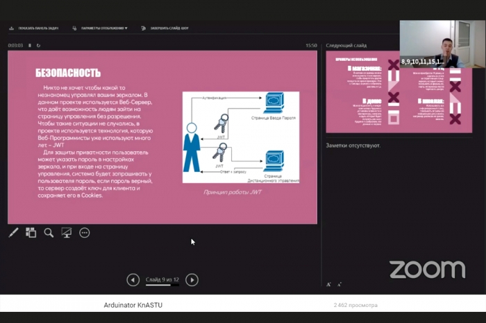 «Несмотря на сложившуюся ситуацию в мире, мы успешно провели пятый по счёту конкурс робототехнических проектов Arduinator в онлайн-формате в КнАГУ. Данный формат дал возможность привлечь команды участников со всей России (Москвы, Московской и Курской областей, Пензы, всего Хабаровского края), что позволило конкурсу претендовать на статус всероссийского. Команды школьников 5-11-х классов и студентов 1-2-х курсов учреждений среднего профобразования боролись в 4 номинациях конкурса. На нашей интернет-площадке была организована онлайн-выставка роботов, и каждый участник в режиме онлайн защитил свои проекты», ‒ поделился организатор конкурса Ю. С. Иванов.