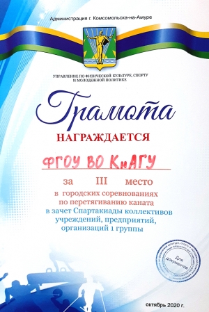 Студенты КнАГУ успешно проявили себя в Спартакиаде среди коллективов предприятий, учреждений и организаций 1-й и 2-й группы города Комсомольска-на-Амуре на 2020 год, посвящённой 75-й годовщине Победы в Великой Отечественной войне.