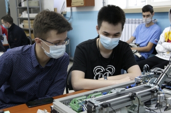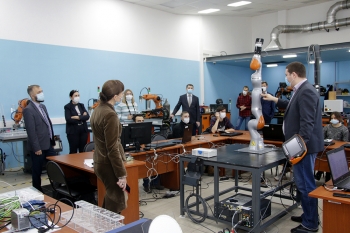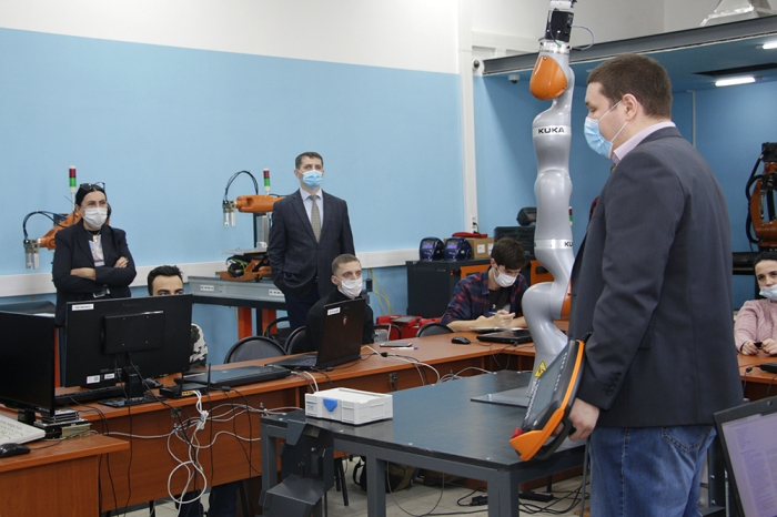 Затем гостей ждала экскурсия в научно-образовательный центр «Промышленная робототехника и передовые промышленные технологии», где руководитель центра С. И. Сухоруков и декан факультета энергетики и управления А. С. Гудим рассказали о развитии автоматизации и робототехники на российском Дальнем Востоке, продемонстрировали возможности роботизированной техники, рассказали о реализации образовательных программ, исследовательских и инжиниринговых проектов в области промышленной автоматизации и робототехники с применением новейших производственных технологий. Центр был создан на средства гранта Министерства образования и науки Российской Федерации и состоит из двух лабораторий, оснащённых самым современным оборудованием: лаборатории промышленной автоматики и лаборатории промышленной робототехники.