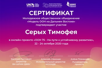 В 2020 году Организация Объединенных Наций отмечает свою годовщину – 24 октября ООН исполнилось 75 лет. В период огромных потрясений для всего мира, нам особенно необходимы диалог и обсуждение приоритетов для человечества. Так, с 22 по 24 октября прошел онлайн-проект «ООН 75 – На пути к устойчивому развитию», в котором приняли участие более 50 студентов из таких городов как Владивосток, Благовещенск, Братск, Комсомольск-на-Амуре, Москва, Нижний Новгород, Санкт-Петербурга и Томск. Организатором мероприятия выступило молодежное общественное объединение «Модель ООН на Дальнем Востоке» (МООНДВ).