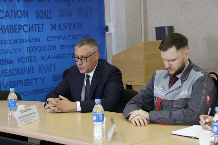 На деловой встрече присутствовали: ректор КнАГУ Э. А. Дмитриев, проректор по учебной, воспитательной работе и общим вопросам Т. Е. Наливайко, деканы и преподаватели факультетов технической направленности (ФМХТ, ФЭУ, ФАМТ, ФКТ), директор колледжа, а также начальник учебно-методического управления Е. Е. Поздеева, начальник Центра дополнительного профессионального образования Т. В. Ри. В состав делегации ПАО «АСЗ» вошли: заместитель генерального директора по управлению персоналом С. А. Максимов, заместитель главного инженера по подготовке производства С. И. Королев, начальник отдела подбора и обучения персонала Н. В. Сбичакова, специалист по кадрам Г. Р. Алеева.