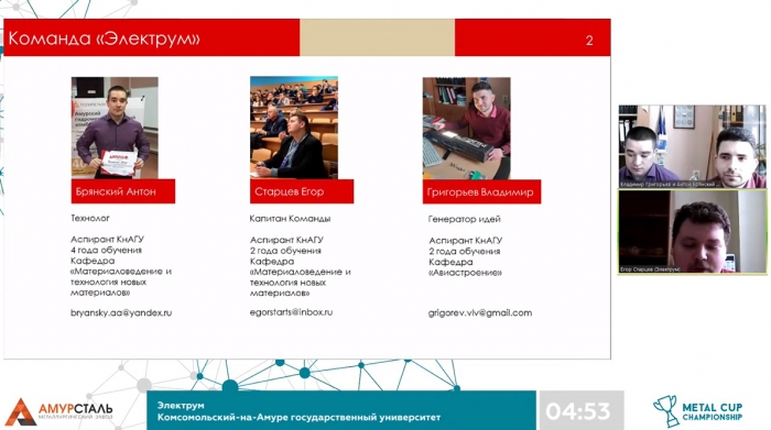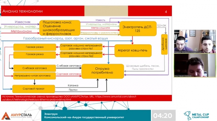 «В этом году в полуфинале нам предоставили кейс предприятия нашего города, это придало нам уверенности, что мы сможем занять 1-е место. Нам необходимо было разработать стратегию сокращения дефицита сырья сталеплавильного производства завода «Амурсталь». В качестве решения мы предложили комплекс мероприятий, включающих себя: модернизацию участка сталеплавильной печи ДСП № 2 конструкцией подогрева и подачи железорудных окатышей; переработку шлака для извлечения железа и последующей переработки шлака в сварочные и строительные материалы. Также была разработана стратегия обеспечения завода “Амурсталь” альтернативными видами металлошихты для обеспечения выплавки стали в 1,5 млн т за 3 года. Нами были детально проанализированы поставщики железорудных окатышей и оценен экономический эффект. Основным итогом предлагаемой стратегии является модернизация производства, существенно снижающая риски убытка производства», ‒ рассказал член команды «Электрум» аспирант Владимир Григорьев.